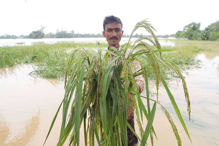 কোলের শিশুকে কাঁধে নিয়ে বন্যার পানি ভেঙে ত্রাণের খোঁজে যাচ্ছেন এক ব্যক্তি। জোগানিয়া কান্দাপাড়া, নালিতাবাড়ী